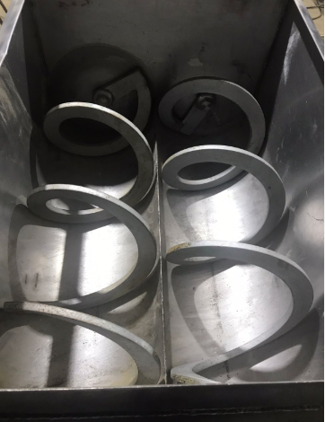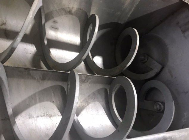 Вращение шнеков к центральной оси емкости позволяет совершать продукту круговое движение по объему емкости, тем самым тщательнее и интенсивнее перемешивая компоненты. Выгрузка продукта производится шнеками через боковые люки.